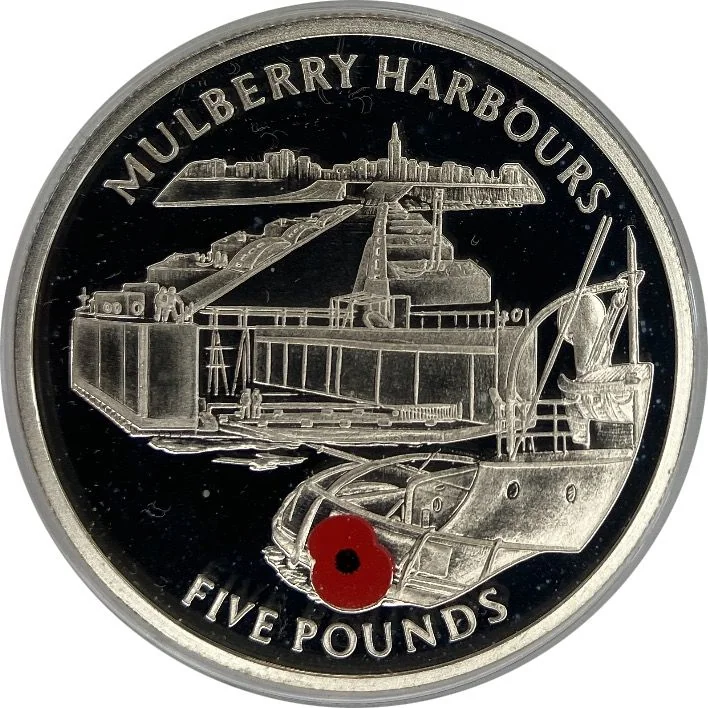 Harbours scene with an arriving ship, a colored poppy below, and the coin's value.