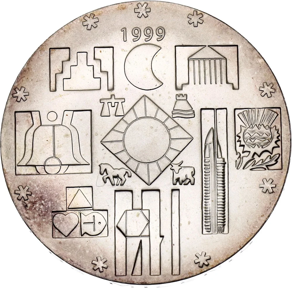 Description: Stylized symbols of humanity's cosmic connection, in the style of Joaquín Torres García's Universal Constructivism. Central sun encircled by four national heraldic symbols, then peripheral symbols: Greek temple, moon, staggered pyramid, bell, thistle, Communications Tower, Universal Man, Golden Rule, triangle, heart, fish.