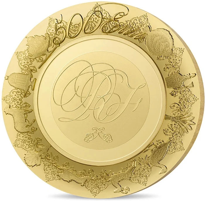 The reverse features callighered "RF" between crossed cornucopias, surrounded by a frieze of culinary motifs.