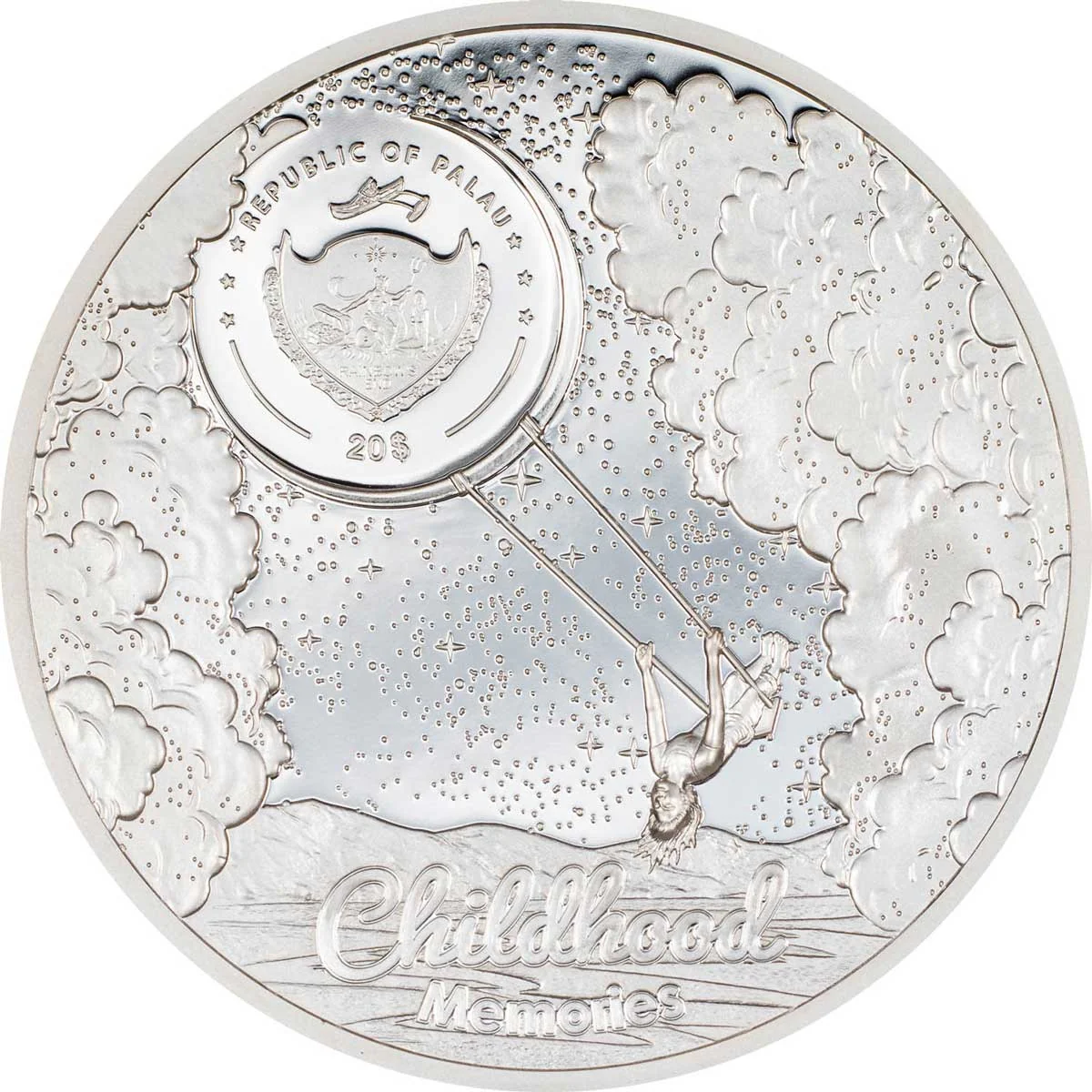 A child swings from Palau's coat-of-arms on a celestial body.