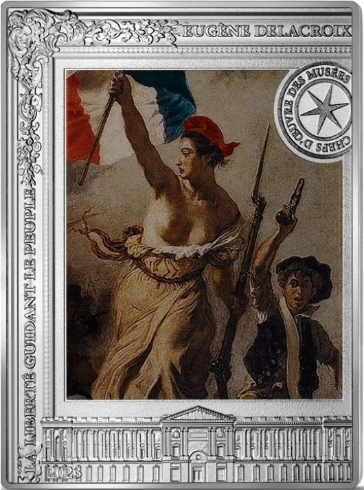 Delacroix's famous 1830 painting *La Liberté guidant le peuple*, featuring Marianne and Gavroche, is colorized on this coin. The Louvre, where the work is held, forms part of the frame. Details include the artwork's title, artist, the year 2023, and the blended "museum masterpieces" stamp.