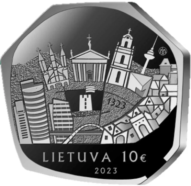 The obverse depicts a bird's-eye view of Vilnius, with Gediminas' Tower at its center surrounded by a kaleidoscopic array of buildings and the city's founding year, 1323. It includes the inscription LIETUVA, the €10 denomination, the 2023 issue year, and the Lithuanian Mint mark.