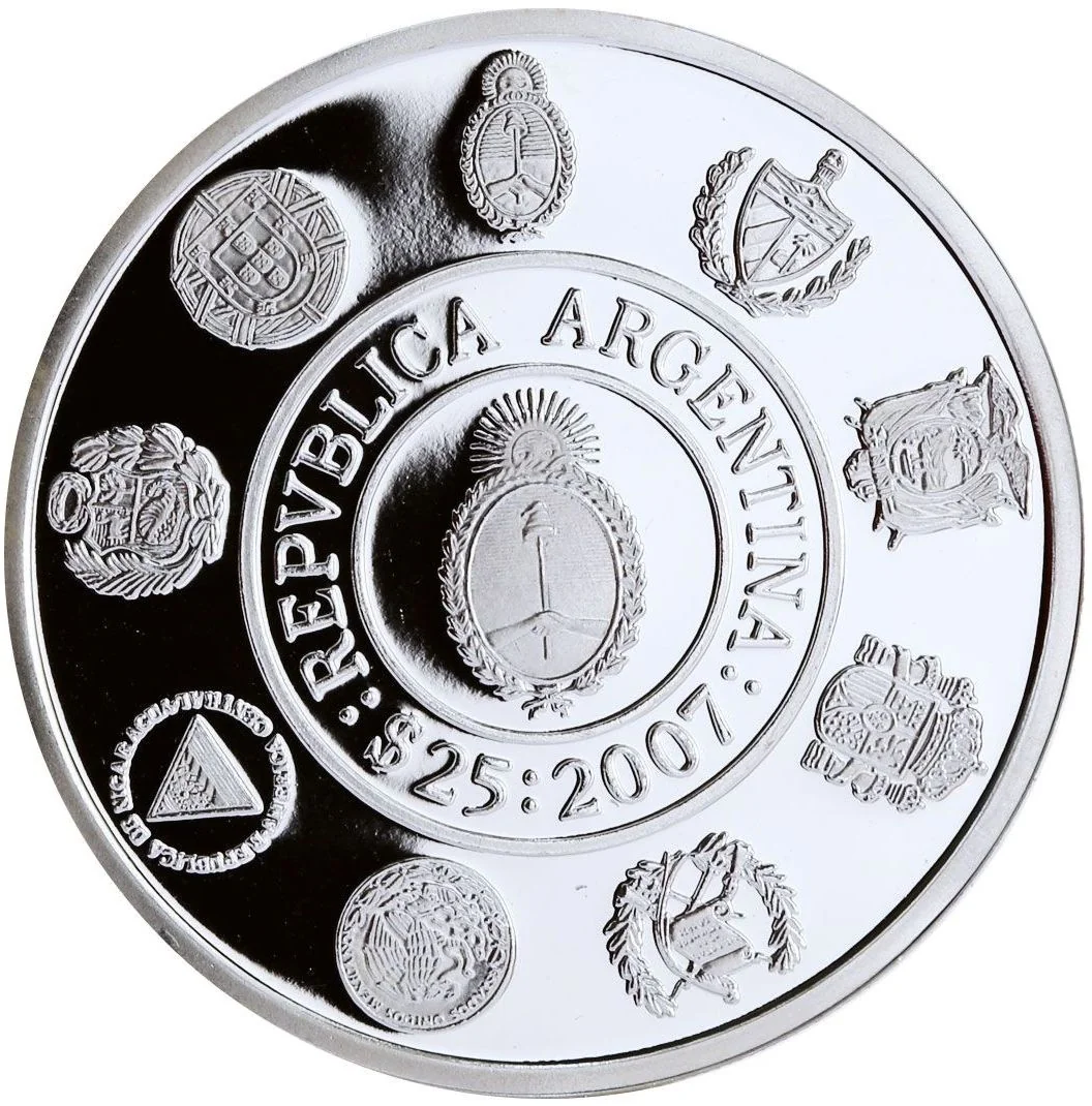 Featuring the inscription "REPVBLICA ARGENTINA", face value "$25", year "2007", and surrounded by shields of all participating countries.