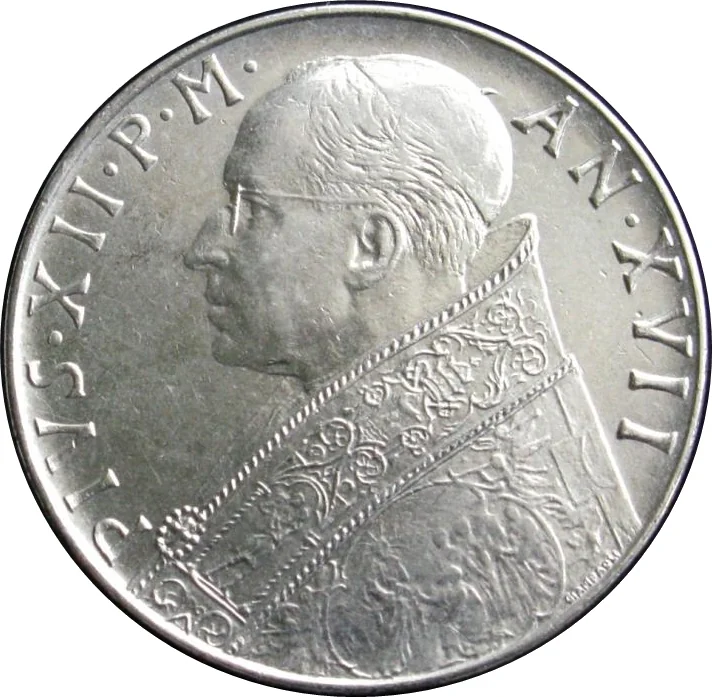 However, the Vatican possessed the sovereign right to issue its own coinage. Since 1929, it had minted distinct Vatican lire coins, which were legal tender within its walls and, crucially, circulated at par with Italian coins throughout Italy and San Marino due to a monetary convention. These coins, featuring the image of Pope Pius XII in 1955, were primarily numismatic and commemorative in nature, aimed at collectors and as papal gifts, rather than for routine commerce. Their issuance was limited and carefully coordinated with Italy to prevent any disruption to the Italian monetary supply.