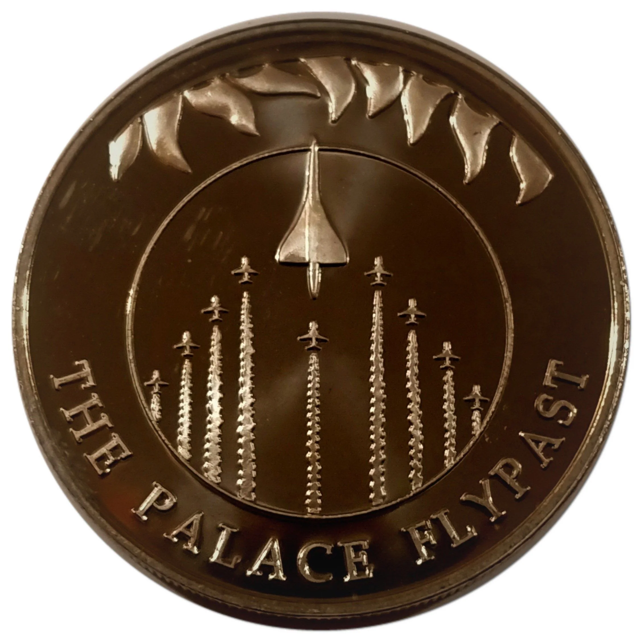 Concorde flying past with nine Red Arrows Hawks in a V formation, against a plain sky.