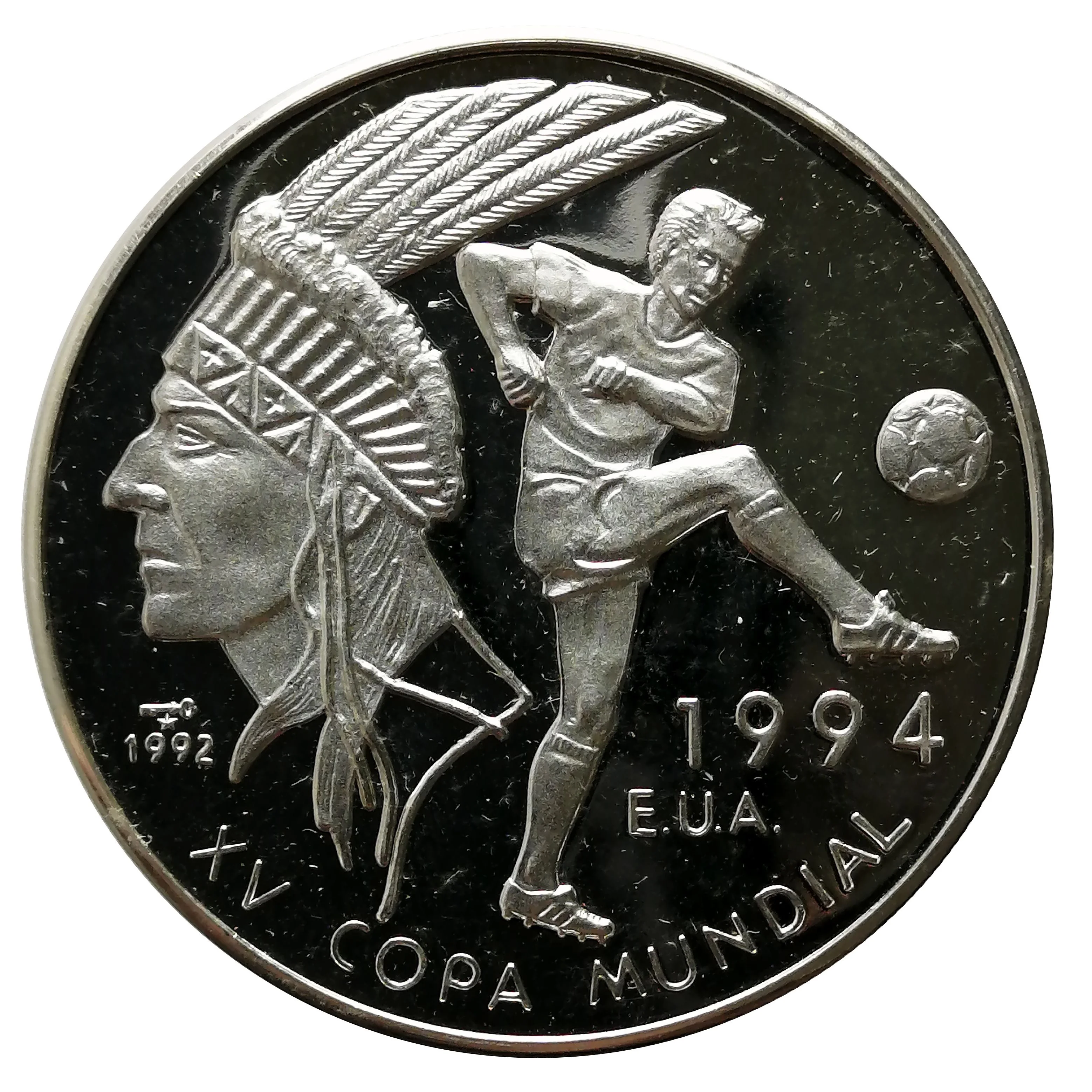 Player kicks ball right, indigenous head left, event year lower right, curved event name below, mint mark and issue year left.