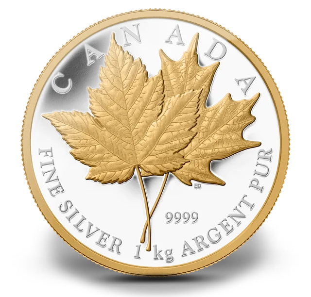 Designed by Emily Damstra, the coin features overlapping Douglas and Sugar Maple leaves with selective gold plating, along with the inscriptions “CANADA” and “FINE SILVER 1 kg ARGENT PUR.”