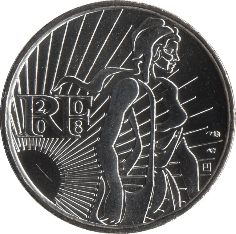 In the foreground, La Semeuse, her hair flowing from her Phrygian cap, carries a seed bag on her right shoulder. The background shows the sun illuminating the sower, the year 2008, and the RF acronym. The author, Joaquin Jimenez, placed the mintmarks and his logo to the right.