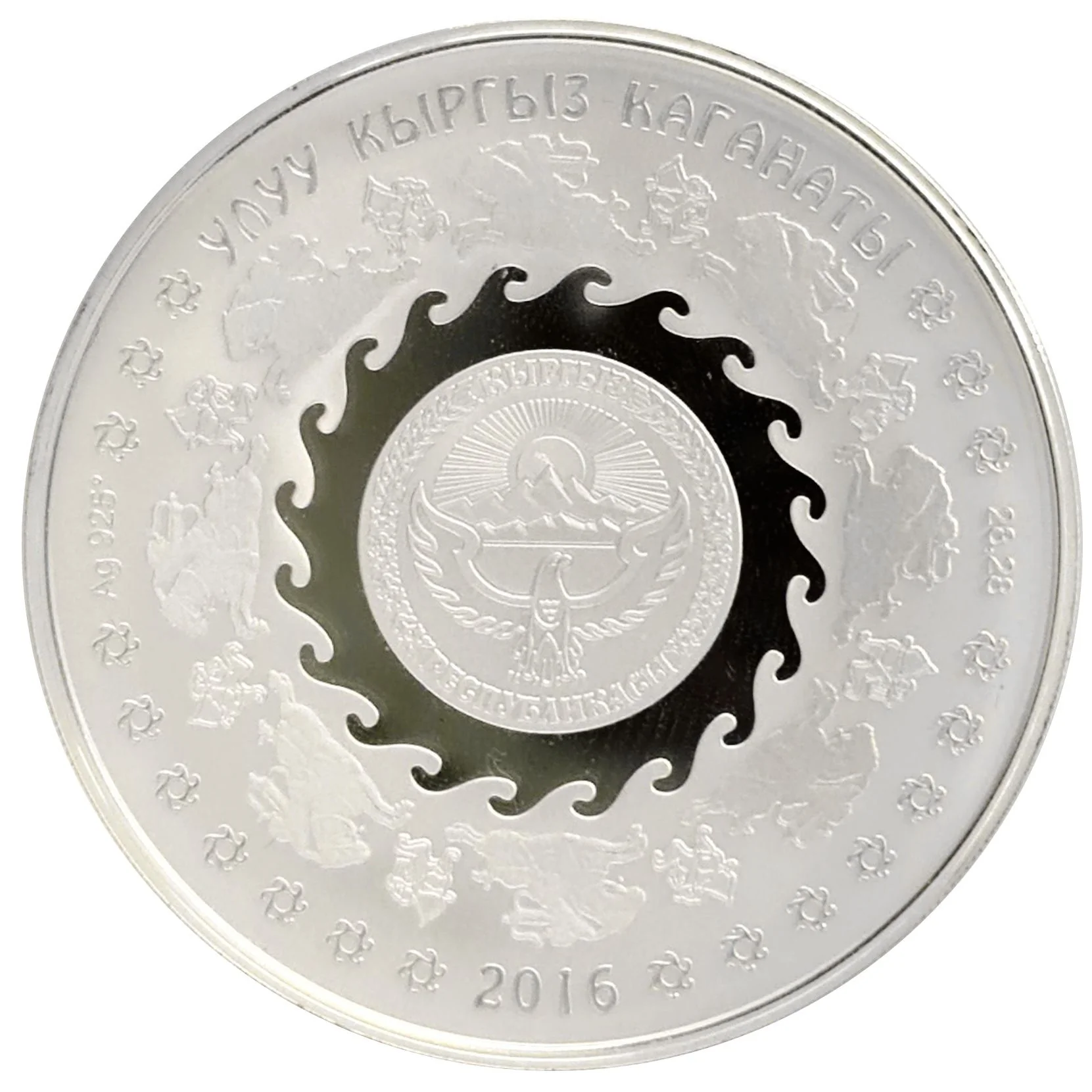 National coat of arms at center, framed by a stylized sun. Warriors encircle the coin, with date below.