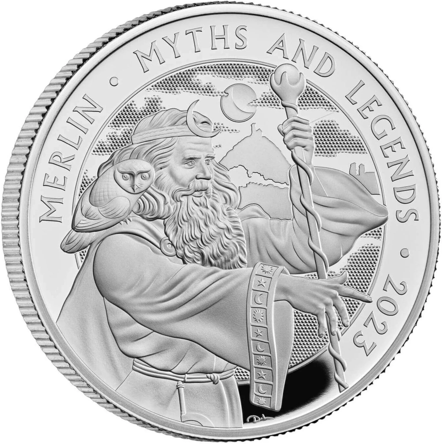 Merlin, staff in hand with an owl on his shoulder, under a moon with encircling legend.