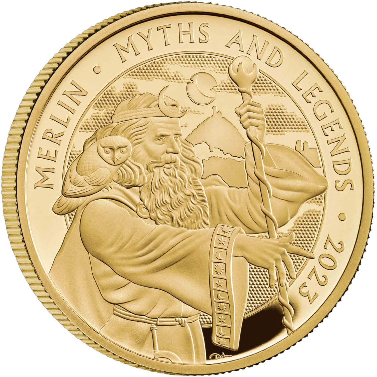 Merlin, staff in hand with an owl on his shoulder, under a moon with encircling legend.