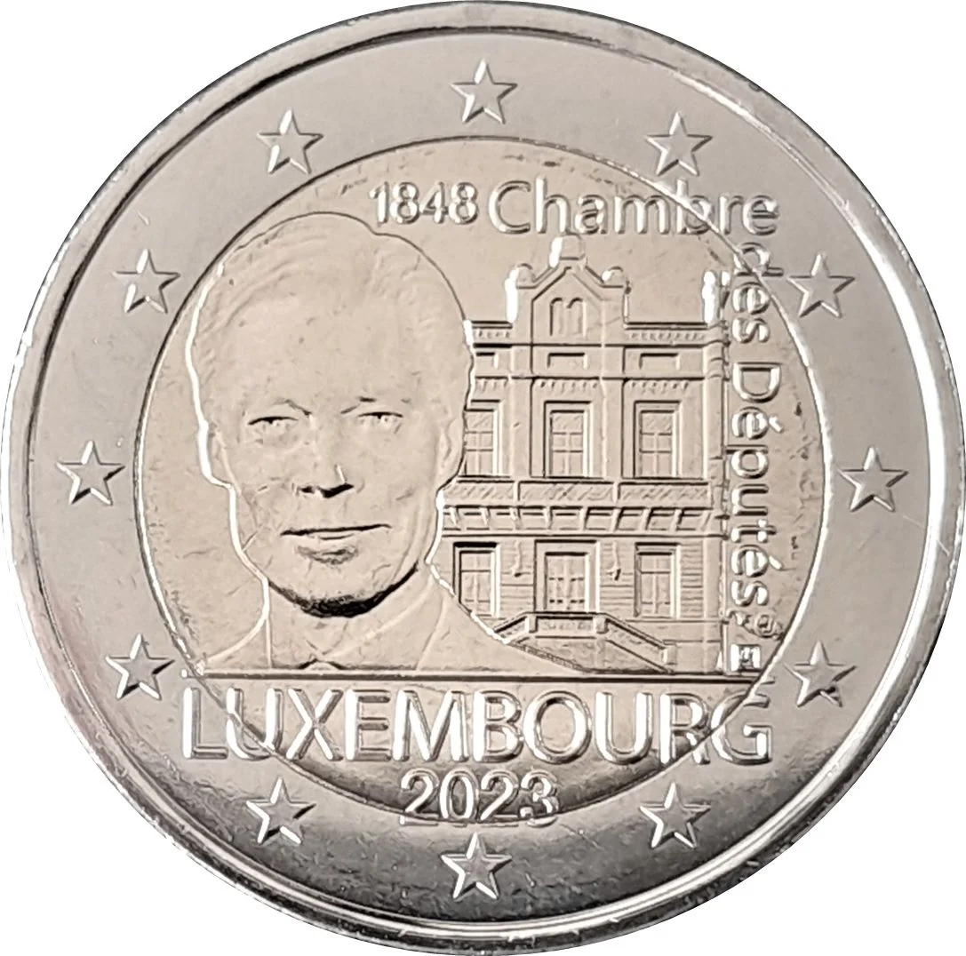 The left side features Grand Duke Henri's effigy, and the right shows the Chamber of Deputies building with '1848' and 'Chambre des députés' beside it. 'LUXEMBOURG' and '2023' are at the bottom center, surrounded by the 12 stars of the European flag.