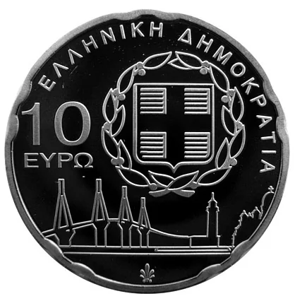 The Greek national emblem, the Rion-Antirion Bridge, and the €10 denomination.