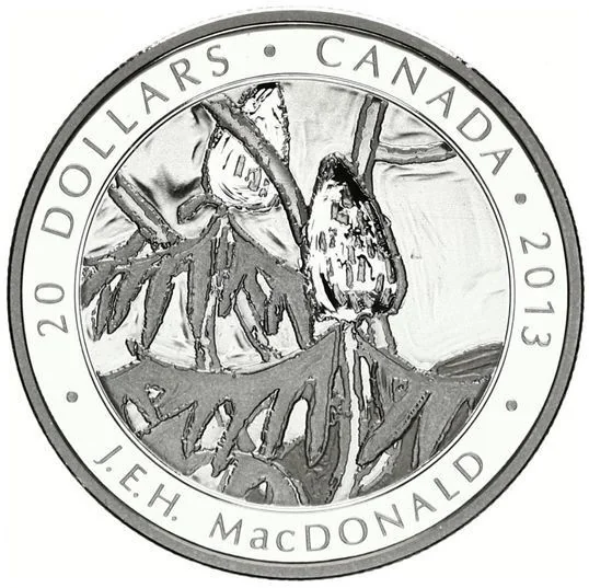 This coin recreates J.E.H. MacDonald's 1915 painting *Sumacs*, originally painted for Dr. James MacCallum's cottage. It captures the work's intense color and texture, depicting autumn sumacs. A polished band frames the image, inscribed with "CANADA," "J.E.H. MacDONALD," "2013," and "20 DOLLARS."