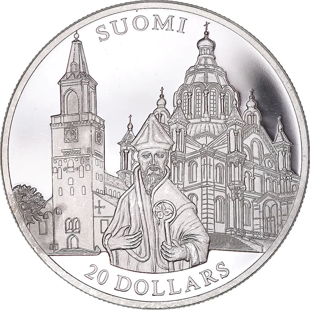 Saint Henry of Uppsala, patron of Finland, before a church.