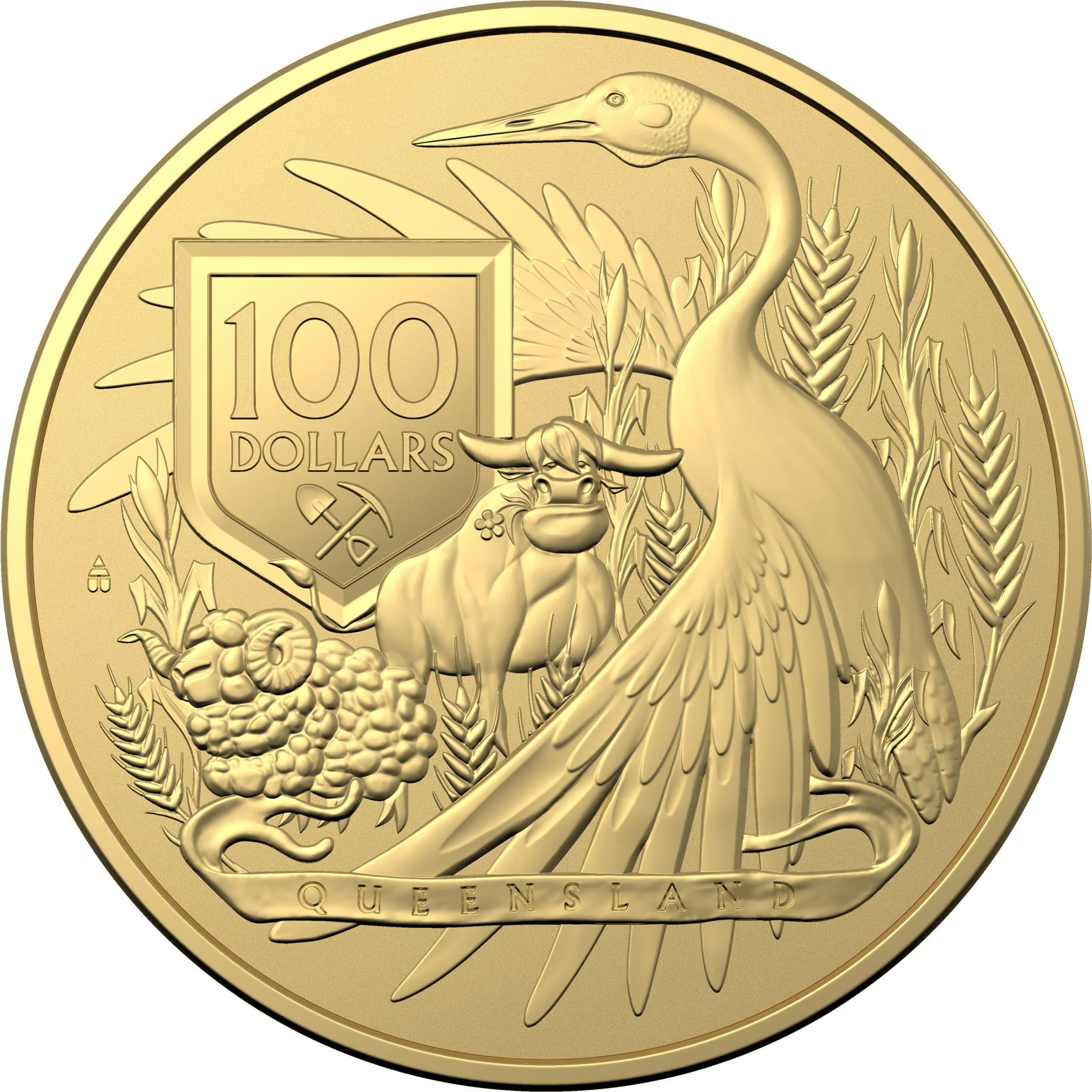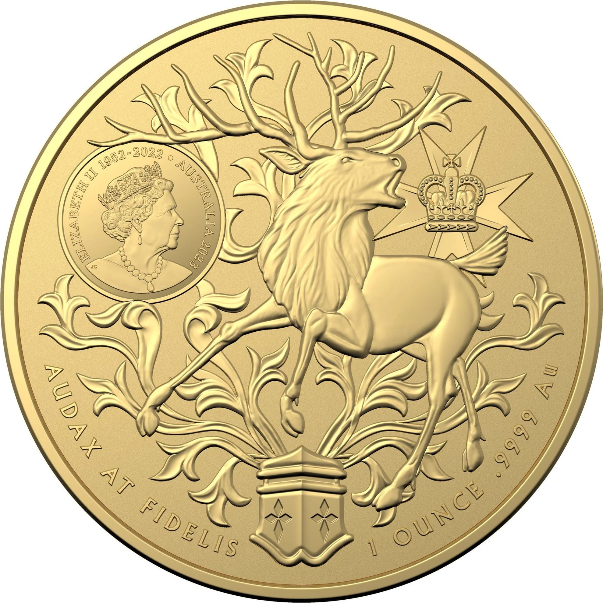 A Red Deer from Queensland's coat of arms beside a Maltese Cross, with the Jody Clark portrait of Elizabeth II on the left and the weight and purity on the right.
