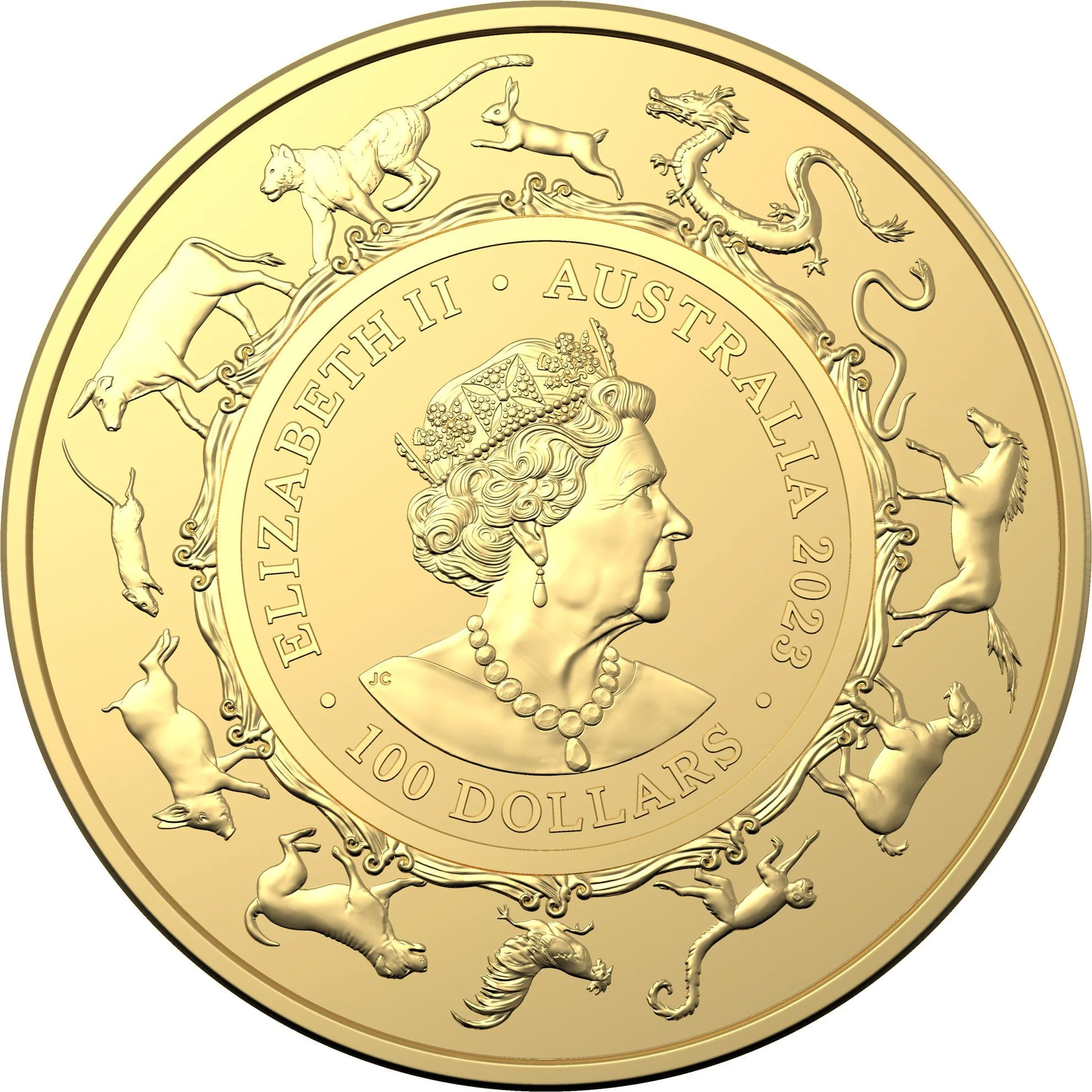 Queen Elizabeth VI in crown and necklace, with lunar animals.