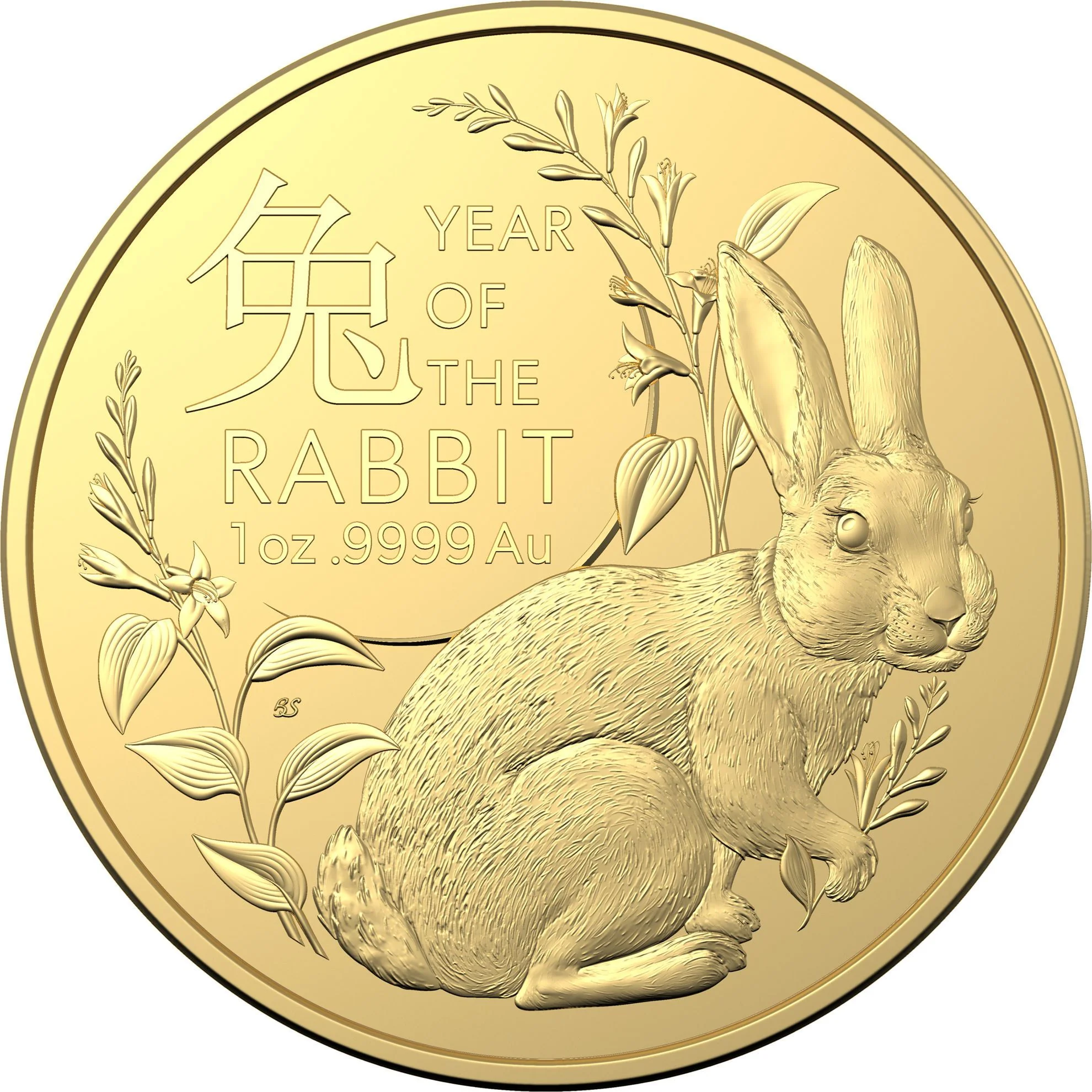 Rabbit facing right, holding plants, with Chinese Rabbit symbol on left.