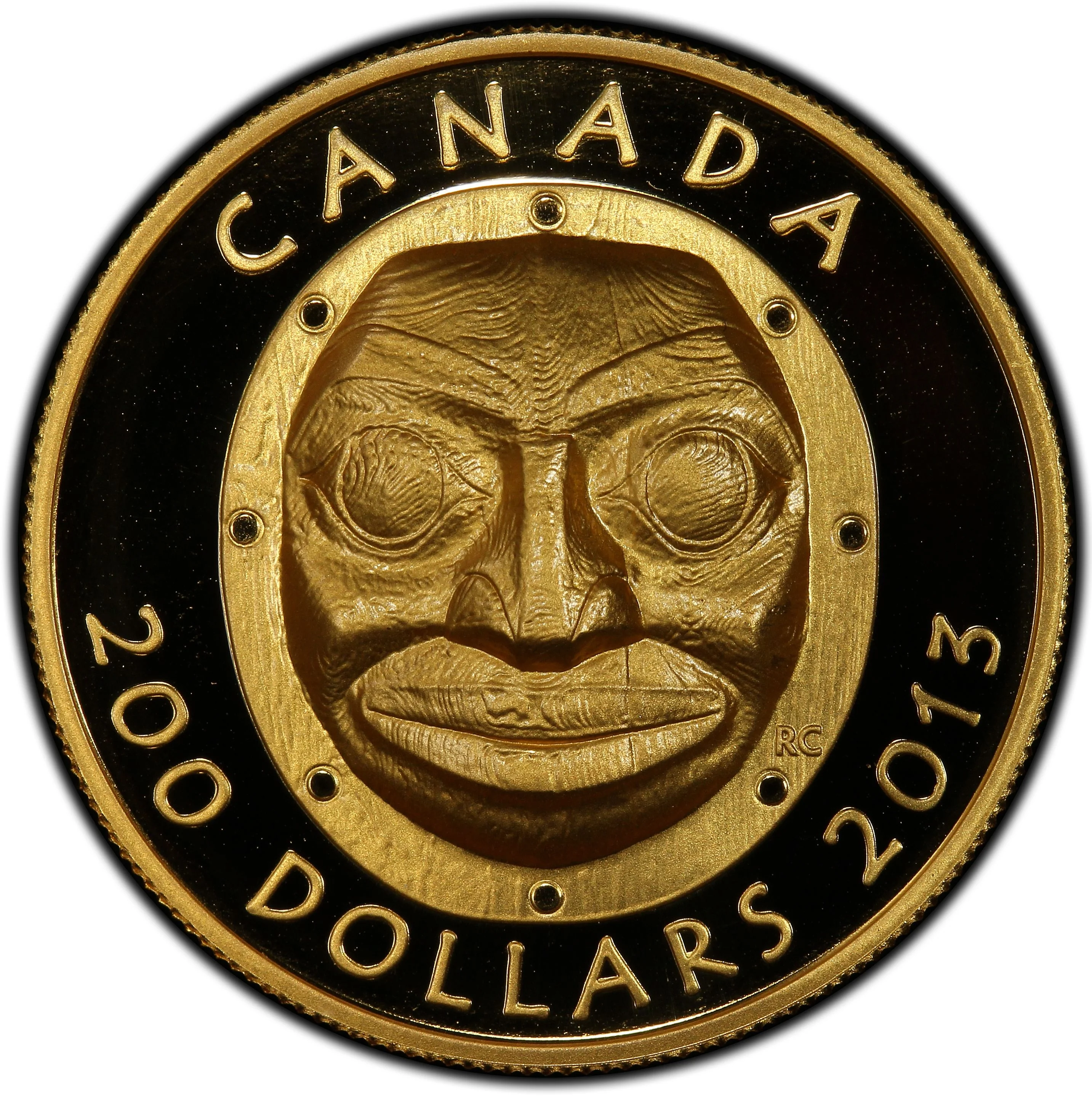 This coin faithfully reproduces a wooden moon mask by Aboriginal artist Richard Cochrane. It captures the original red cedar's wood grain, two dark growth lines, and a ring of eight abalone shells. The reverse includes "CANADA," the date "2013," and the face value of "200 DOLLARS."