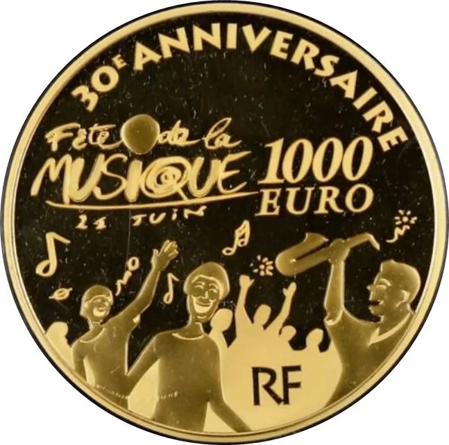 Stylized people at the global Fête de la Musique festival on June 21. The logo reads "Fête de la MUSIQUE 21 JUIN," with "30TH ANNIVERSARY" above.