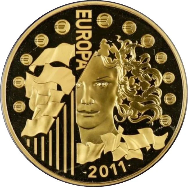 Portrait of Europa with stars in her hair, above an arc of 12 "€" symbols. To her left, European flags on mats.
