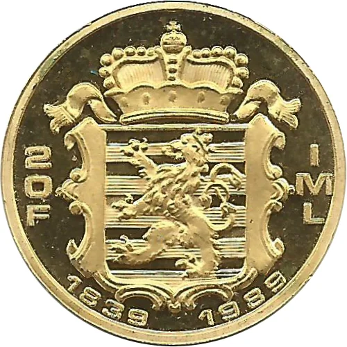 Luxembourg's coat of arms, based on the 1854 grand-ducal shield. The face value is left of the shield, the IML initials (Luxembourg Monetary Institute) are to the right, with commemorative dates below.