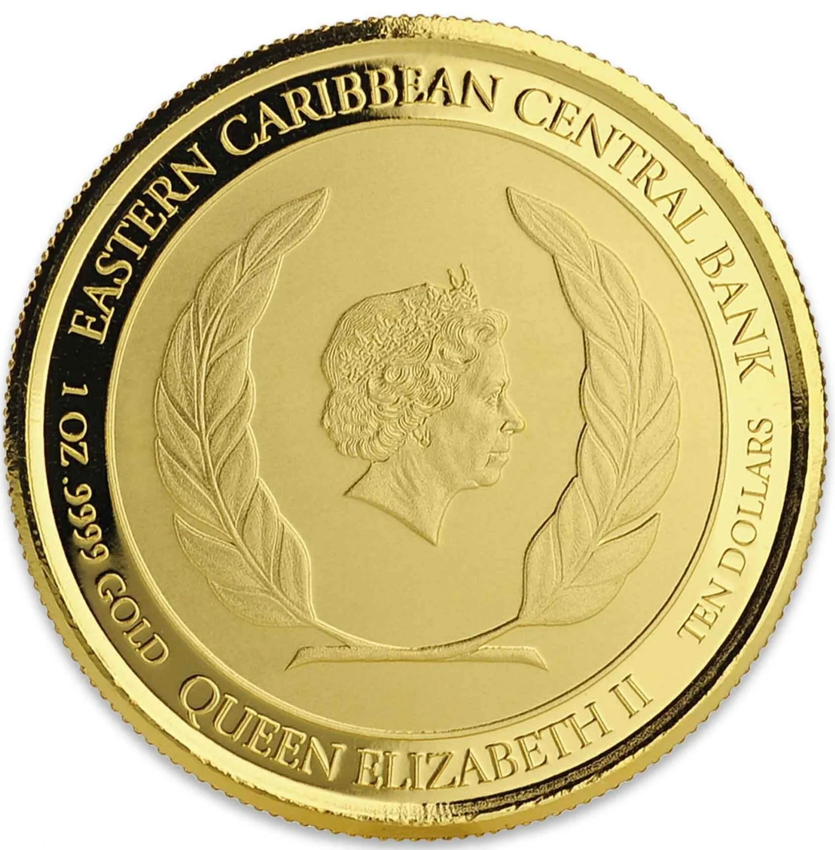Elizabeth II portrait with laurels and surrounding lettering.