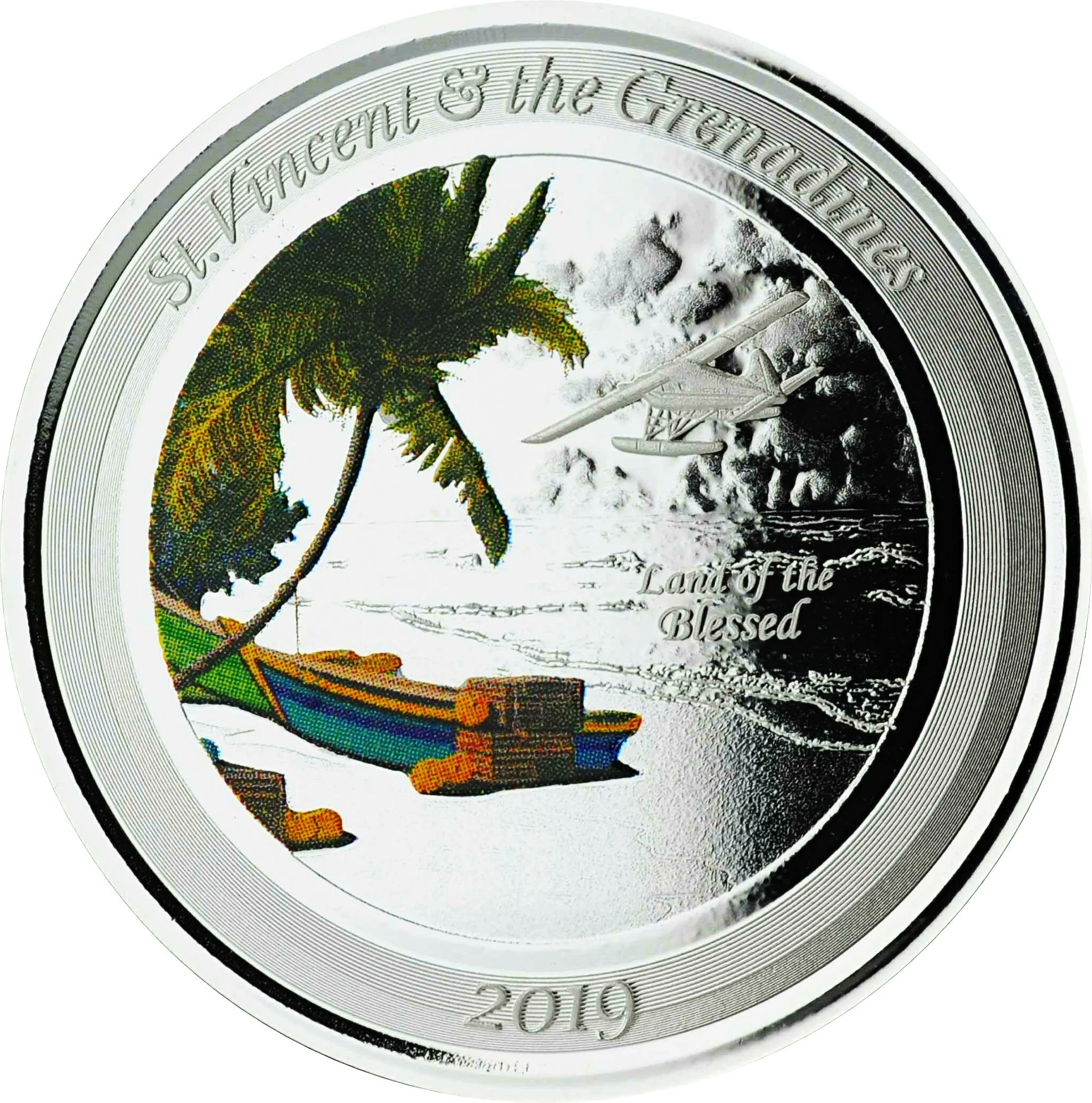 Colored rowboats and supplies on a sandy beach under a palm tree, with a distant seaplane.