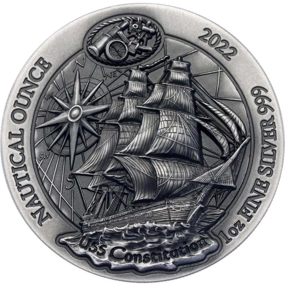 USS Constitution center-right, compass rose upper left, nautical instruments upper centre.