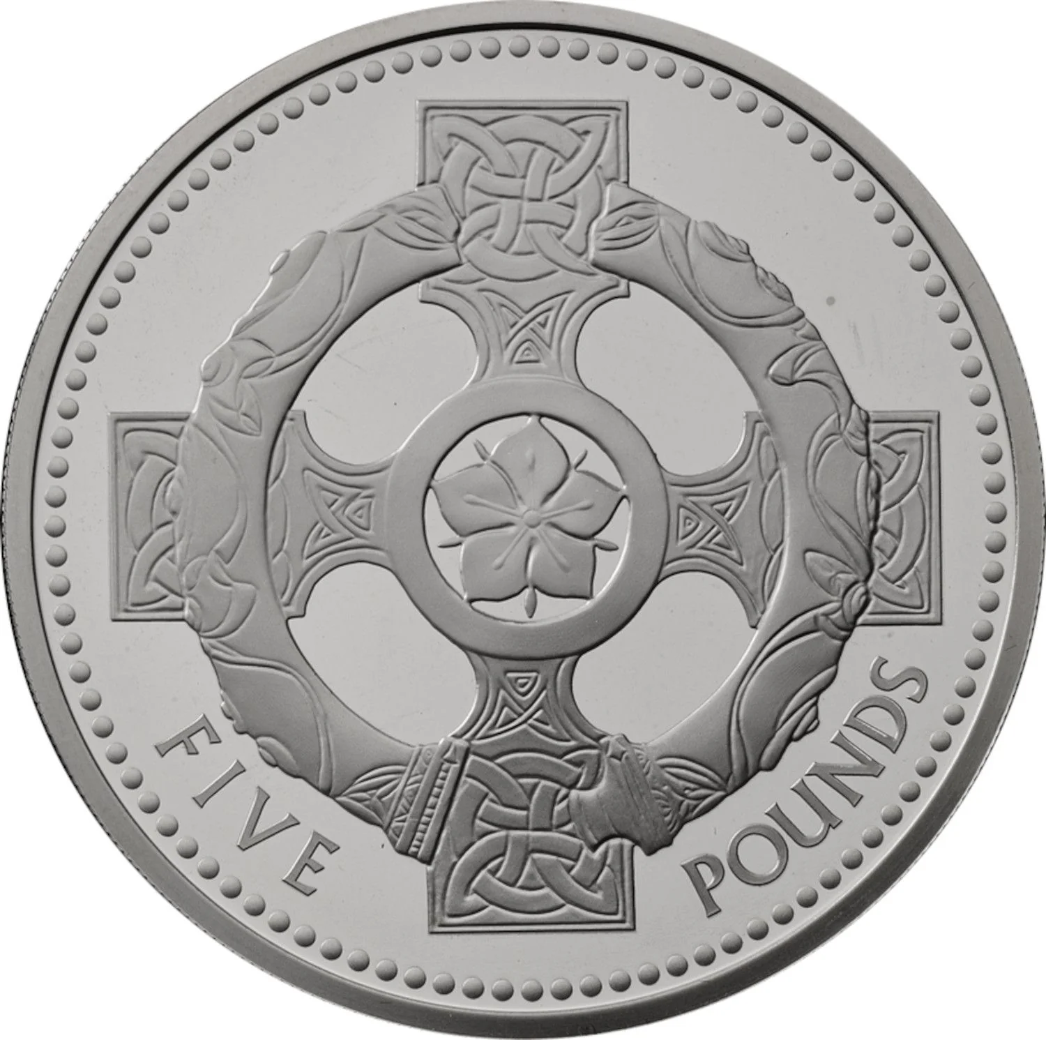 A Celtic cross with a central annulet enclosing a Pimpernel flower, overall an ancient Torque, denomination below.