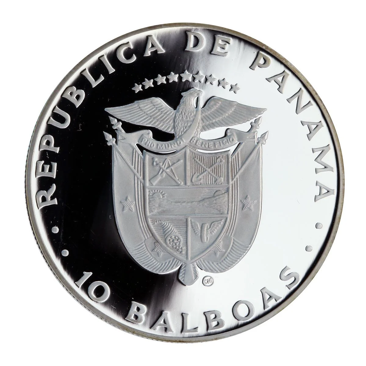 Description: Indigenous Panamanian dancer in headdress, holding a stick with a stuffed jaguar on his back. Text on sides, date below.