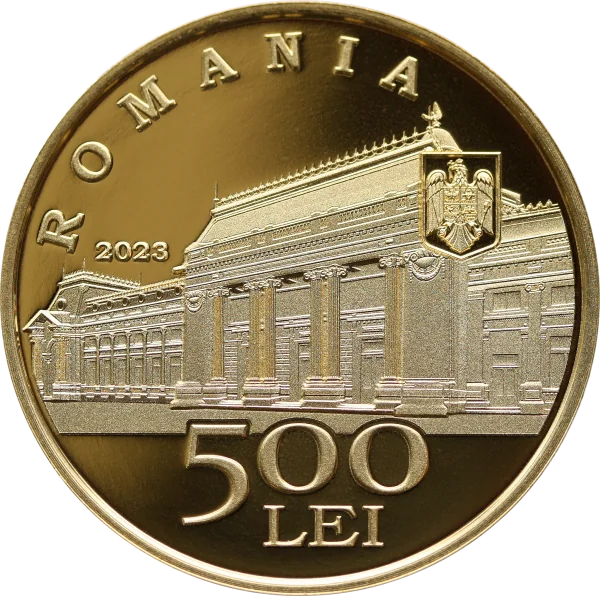 Interwar Romanian Parliament building, arched "ROMANIA," year 2023, national coat of arms, and "500 LEI."