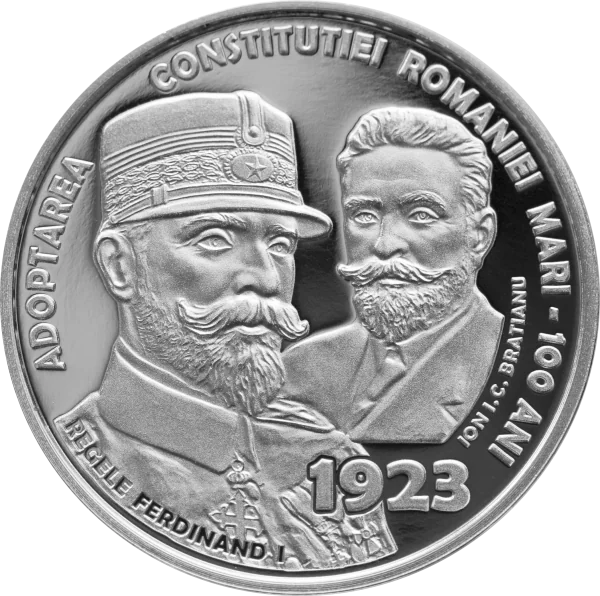King Ferdinand I and Ion I.C. Brătianu, with inscriptions: "ADOPTION OF THE CONSTITUTION OF GREAT ROMANIA - 100 YEARS" and "1923".