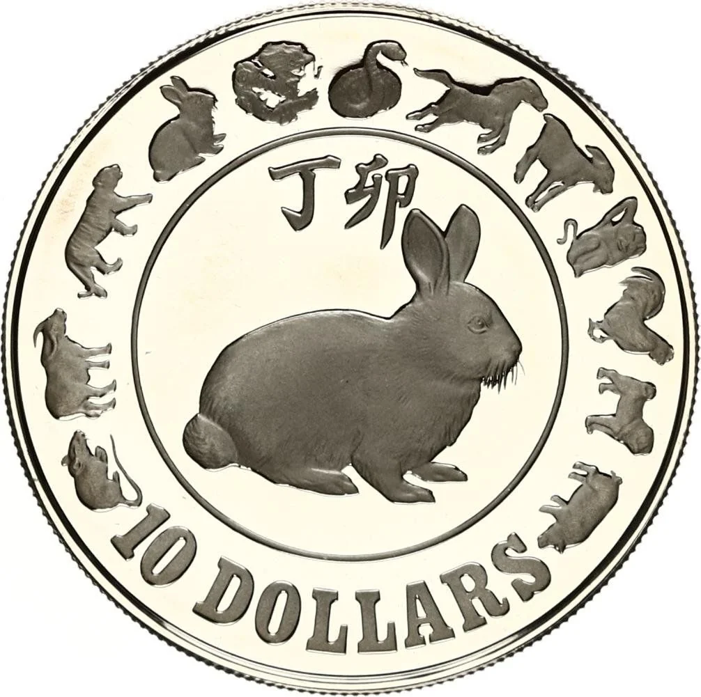 Rabbit facing right inside circle, with "10 DOLLARS" below and lunar animals around the border.