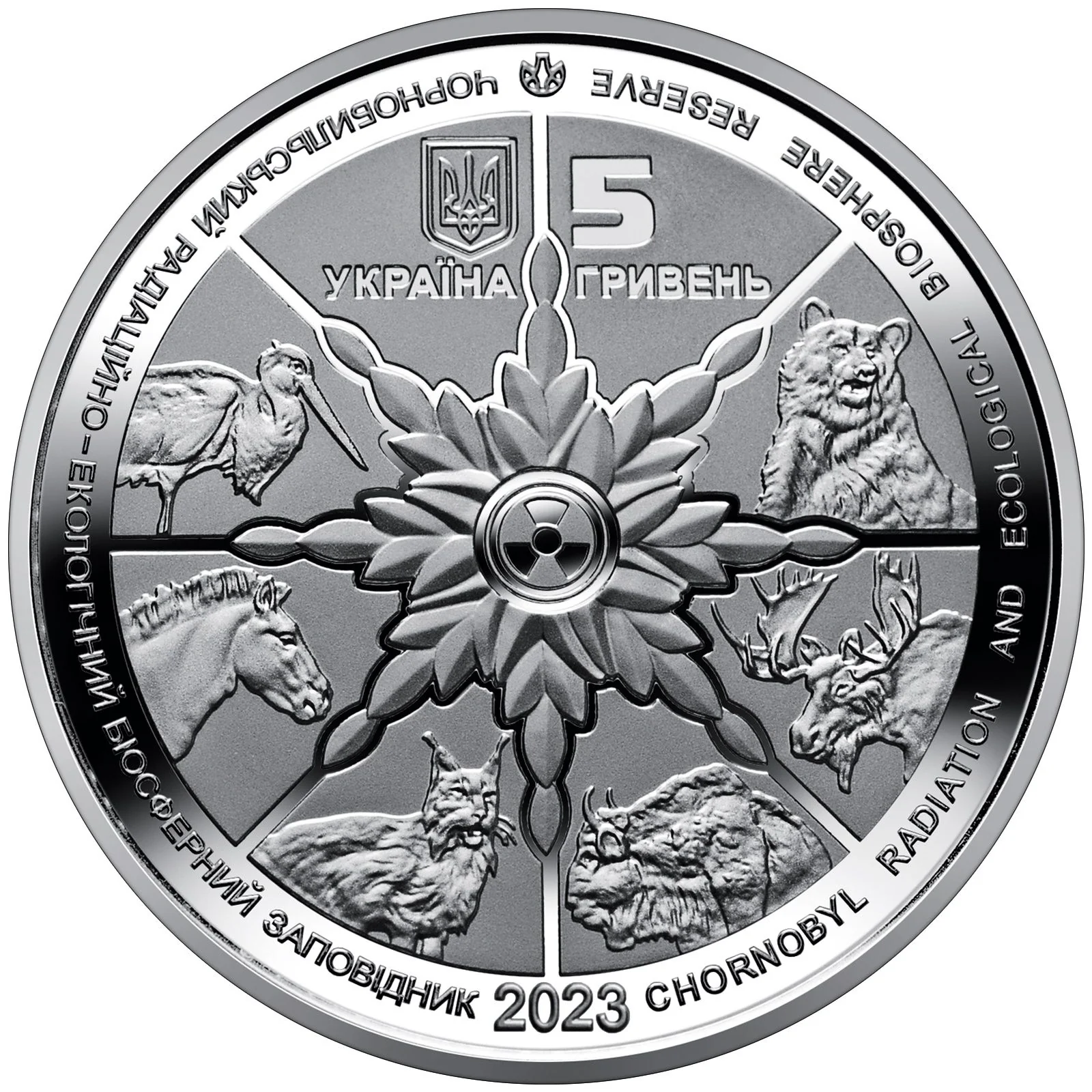 The obverse features Ukraine's Coat of Arms, the denomination "5 ГРИВЕНЬ," and a central "wheel of life" motif. This combines a stylized radiation symbol with leaves and animals like bison, lynx, and Przewalski's horses, representing the Chornobyl reserve's revival. Surrounding inscriptions name the reserve in Ukrainian and English, along with the year 2023 and the mint mark.