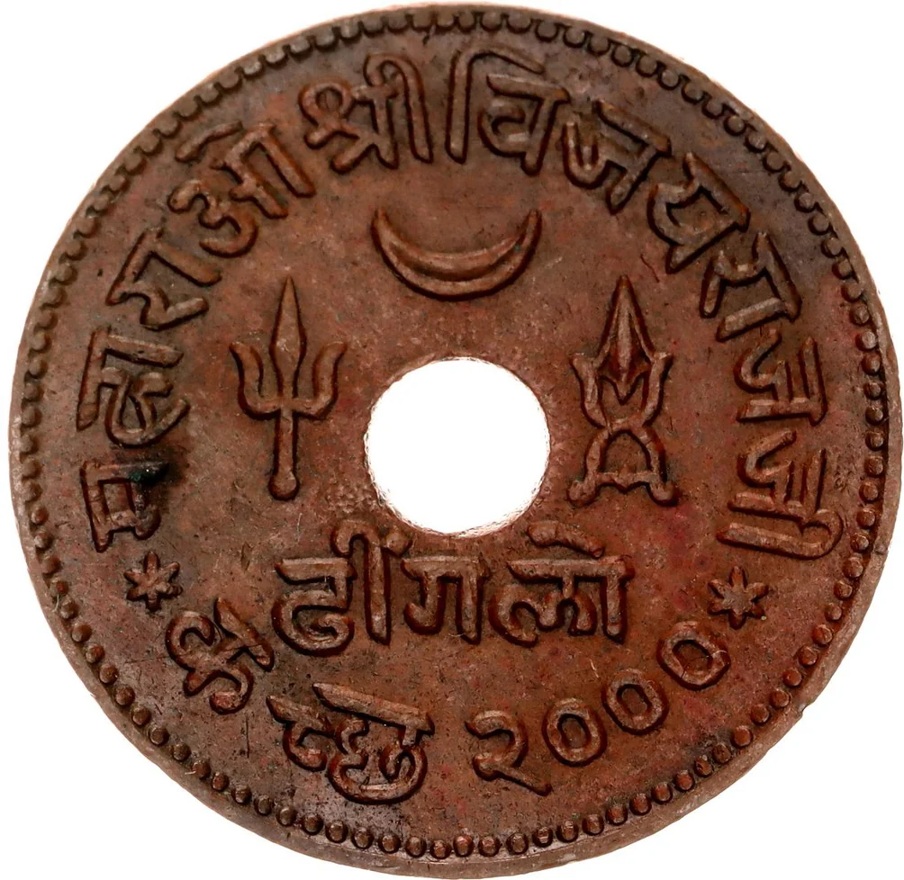 Center: Crescent, trident, dagger. Below: Value. Outer margin: Devnagari legend, VS date.