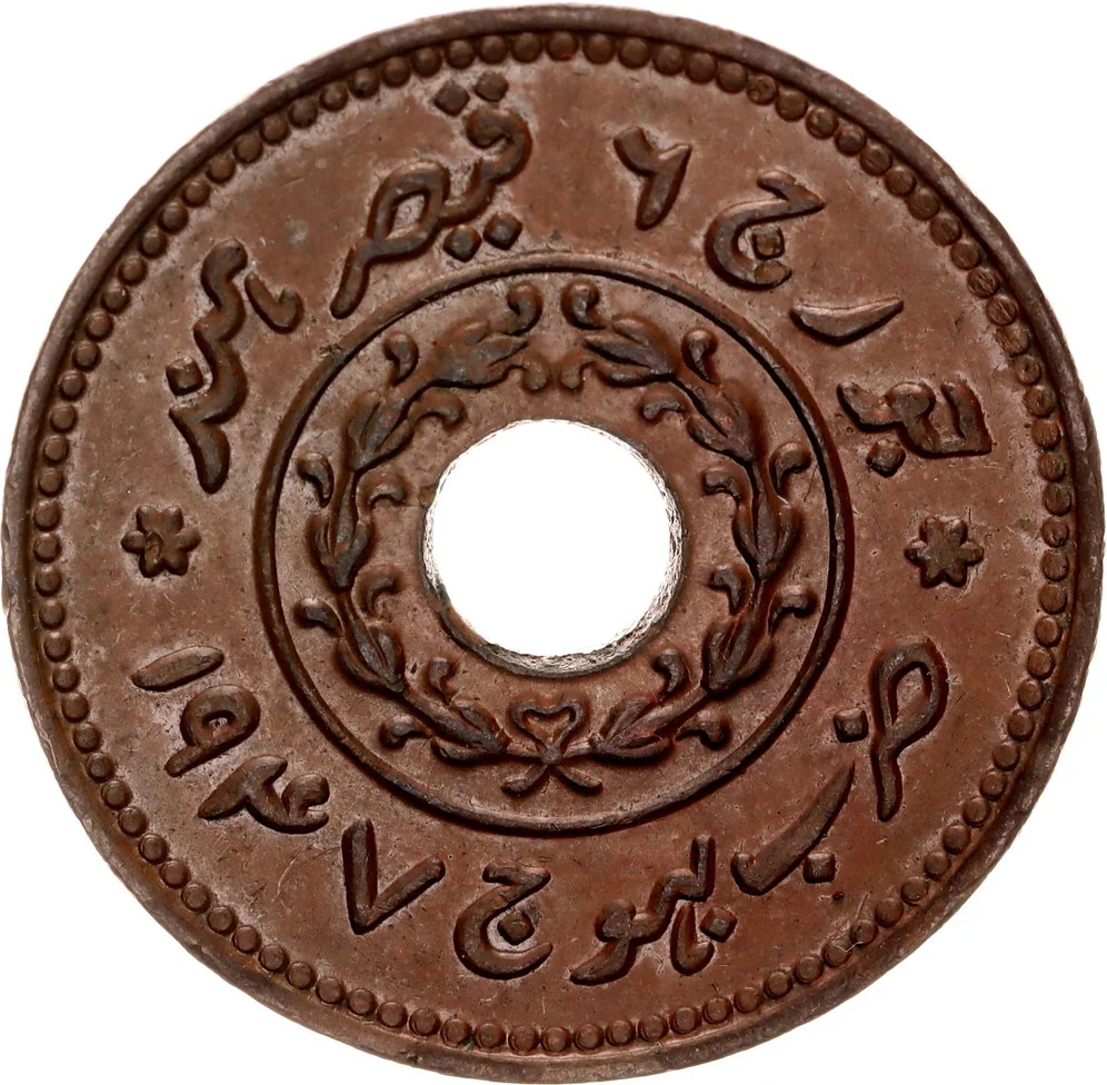 Center: hole with wreath inside plain circle. Outer margin: Urdu legend "George VI, Kaiser Hind, zarb Bhuj," and AD date.