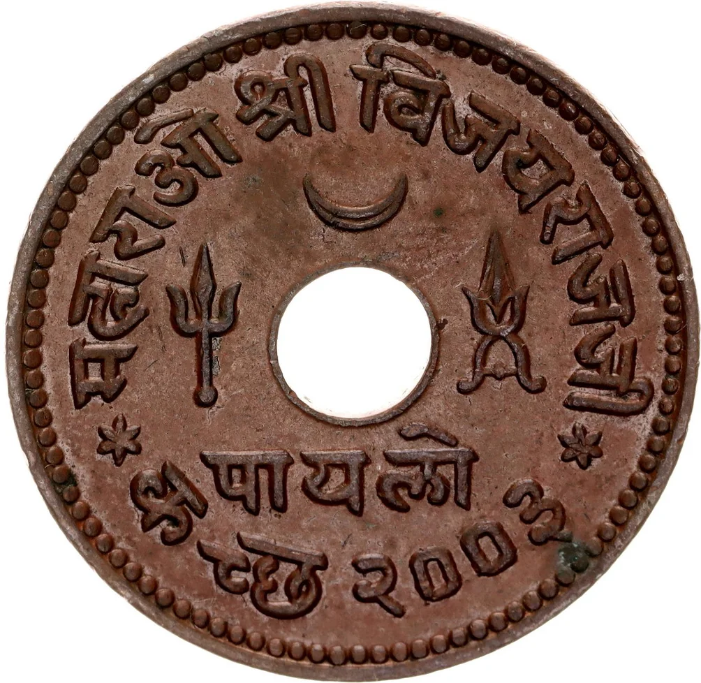 Center: Crescent, trident, dagger. Below: Value. Outer margin: Devnagari legend, VS date.