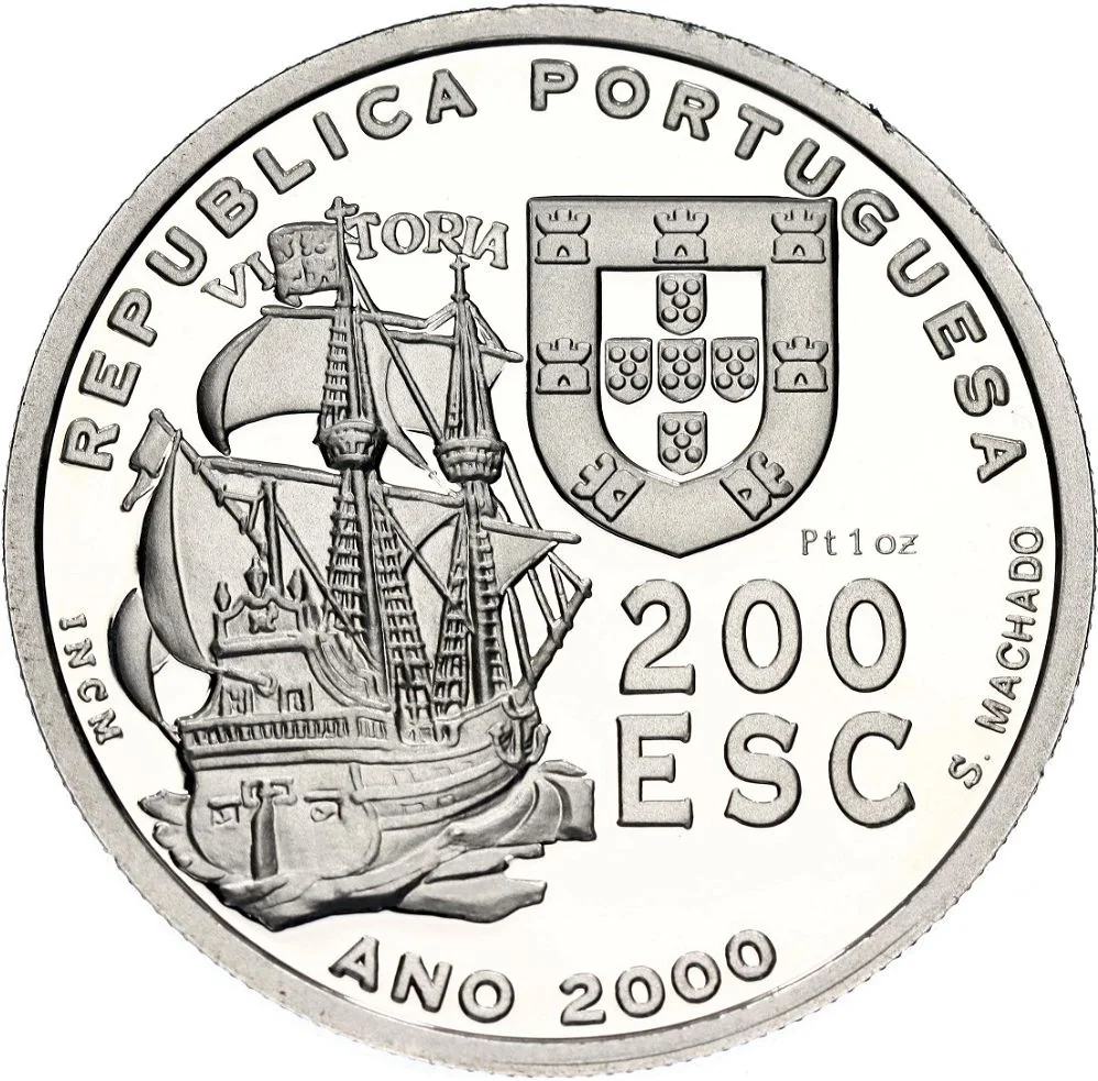 Right: Portugal's coat of arms and value. Left: The stern view of the Victoria, the sole surviving ship from Magellan's expedition, completed by Elcano.