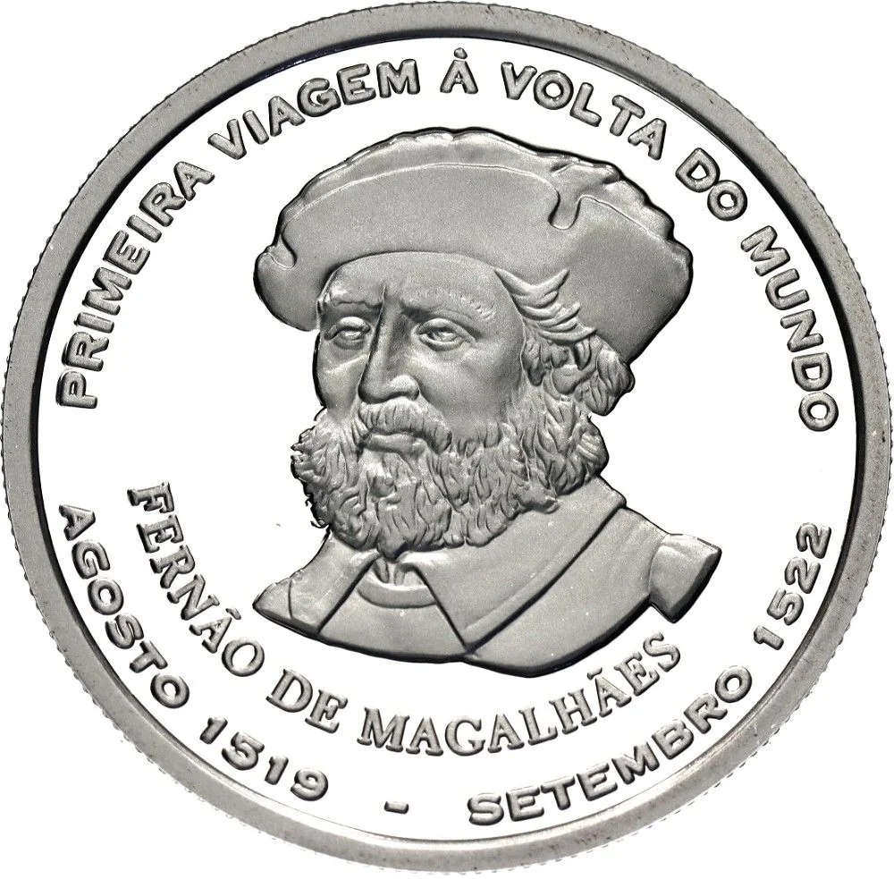 3/4 portrait of Magellan encircled by "First trip around the world" and the expedition dates.