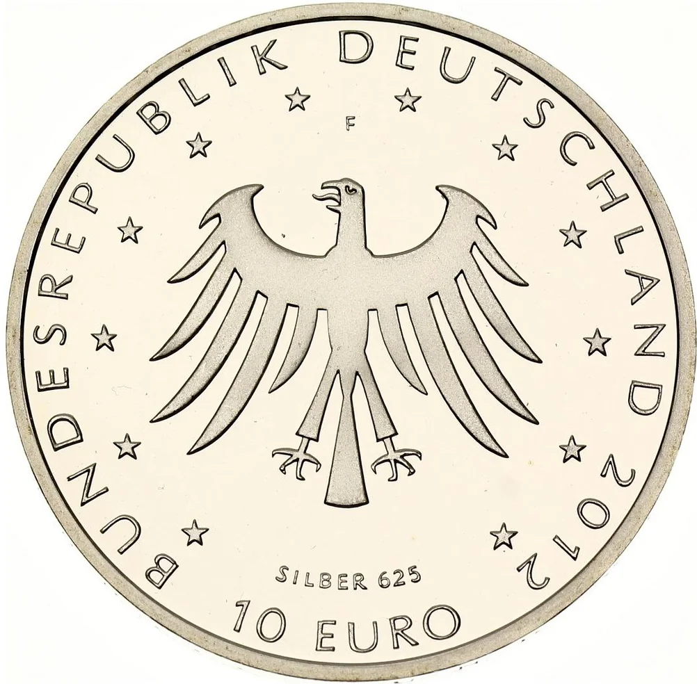 A stylized federal eagle surrounded by twelve EU stars. Above it: "BUNDESREPUBLIK DEUTSCHLAND" and the Stuttgart mint mark "F". Below: the year "2012", face value "10 EURO", and "Silber 625" denoting its silver content.