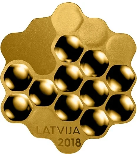 Honeycomb cells trace Latvia's outline and the Gulf of Riga using varied frosting. "LATVIJA" and "2018" appear at the lower left.