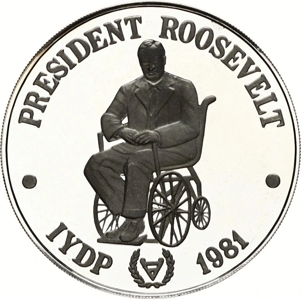 President Roosevelt in wheelchair facing forward, with date and logo for International Year of Disabled Persons below.
