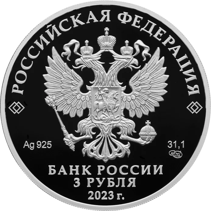 The obverse features the Russian coat of arms, inscriptions for "Russian Federation" and "Bank of Russia," the denomination "3 Roubles," the issue year "2023," the metal's chemical symbol, fineness, mint mark, and fine metal content.