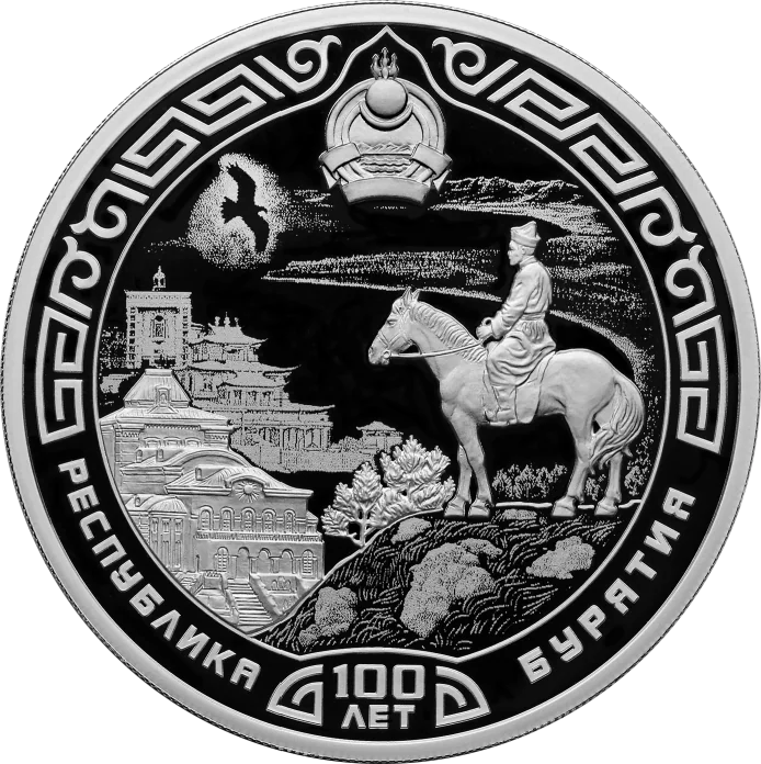 The reverse features relief images of Buryatia's coat of arms, a traditional horseman, the Bestuzhev Drama Theatre, larch trees, the Opera and Ballet Theatre, Ivolginsky Datsan, a flying eagle, Lake Baikal's shores, and textured grass and stones. Around the circumference are a traditional ornament and the relief inscription 'РЕСПУБЛИКА БУРЯТИЯ'. Below, '100 ЛЕТ' is framed by the ornament.