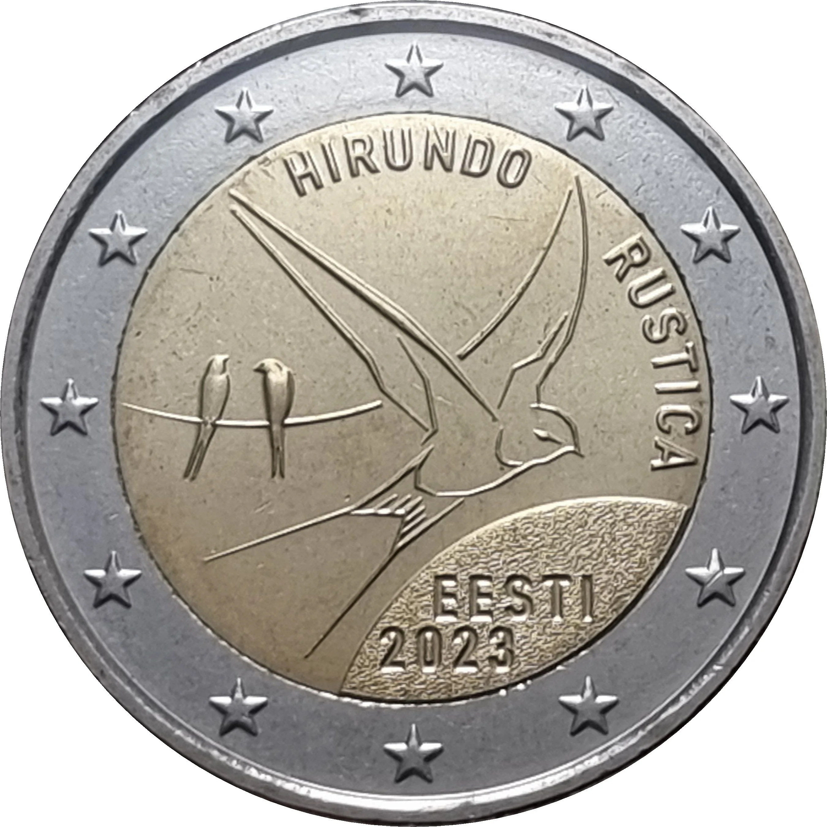 A barn swallow in flight with two perched on a wire. Country name arcs at bottom right, Latin name at the inner ring's top. Twelve European stars in the outer ring.