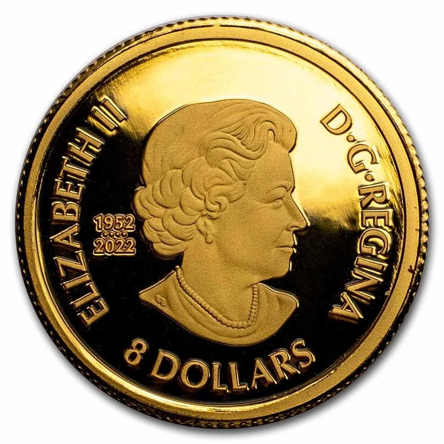 Queen Elizabeth II at 77, facing right, wearing a necklace and earrings. The effigy includes the dates 1952–2022 separated by four pearls, representing her four portraits on Canadian coins.