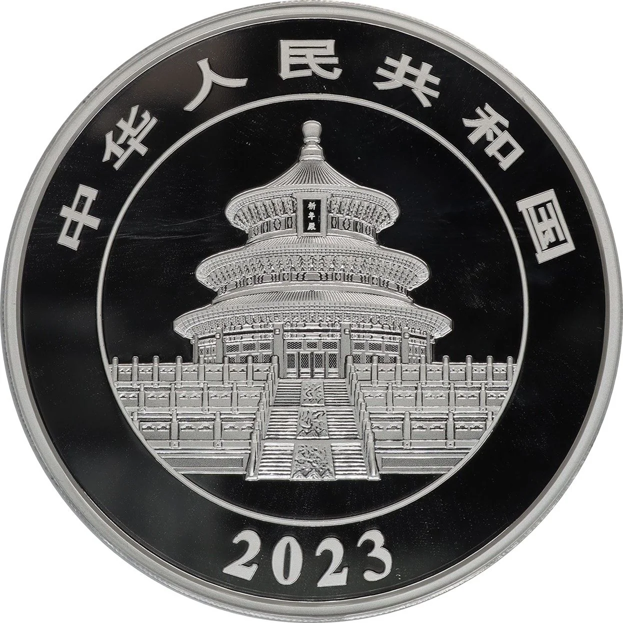 A panda reaches for another resting on a branch, shown with foliage, its face value, weight, type, and purity.