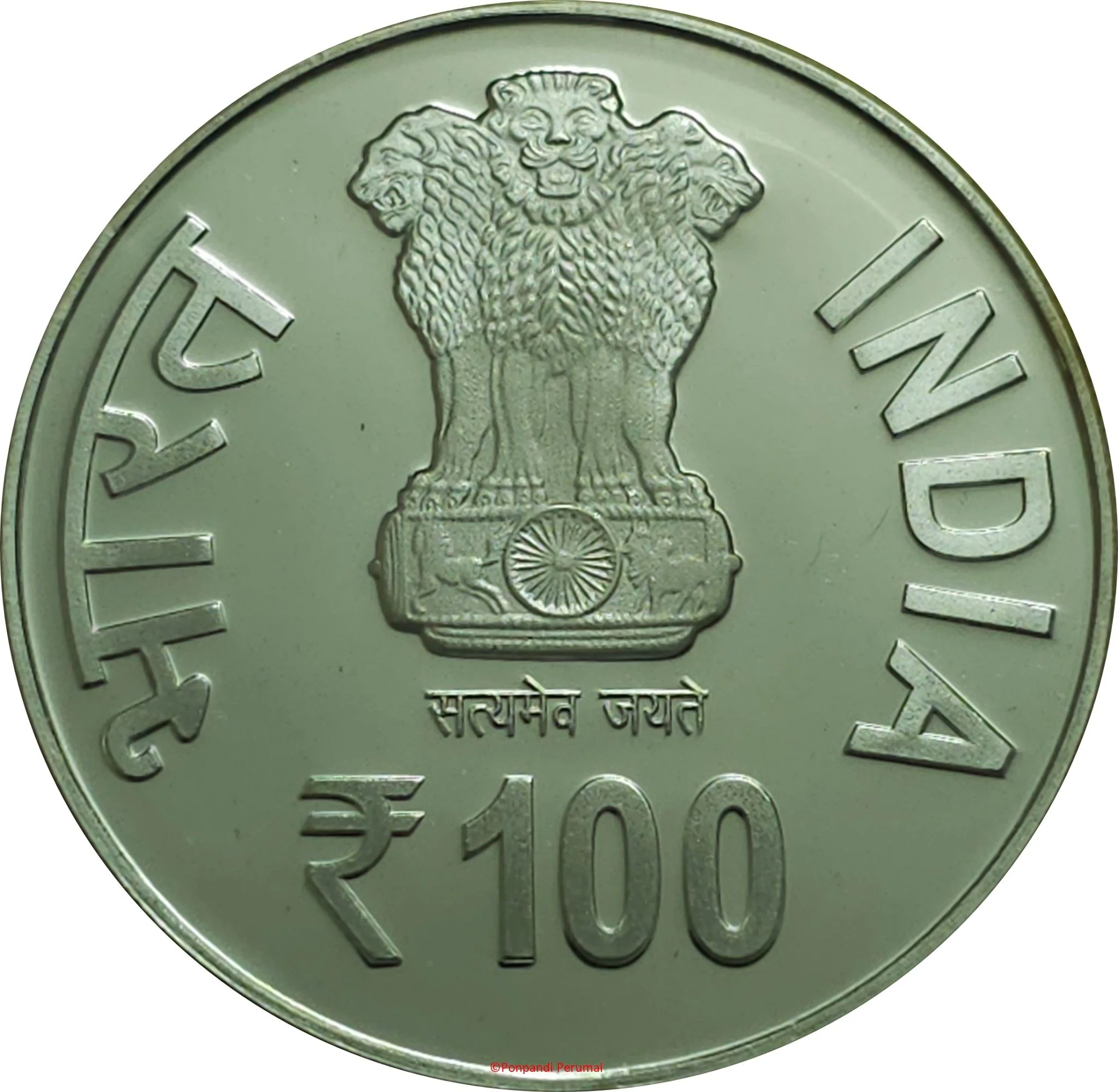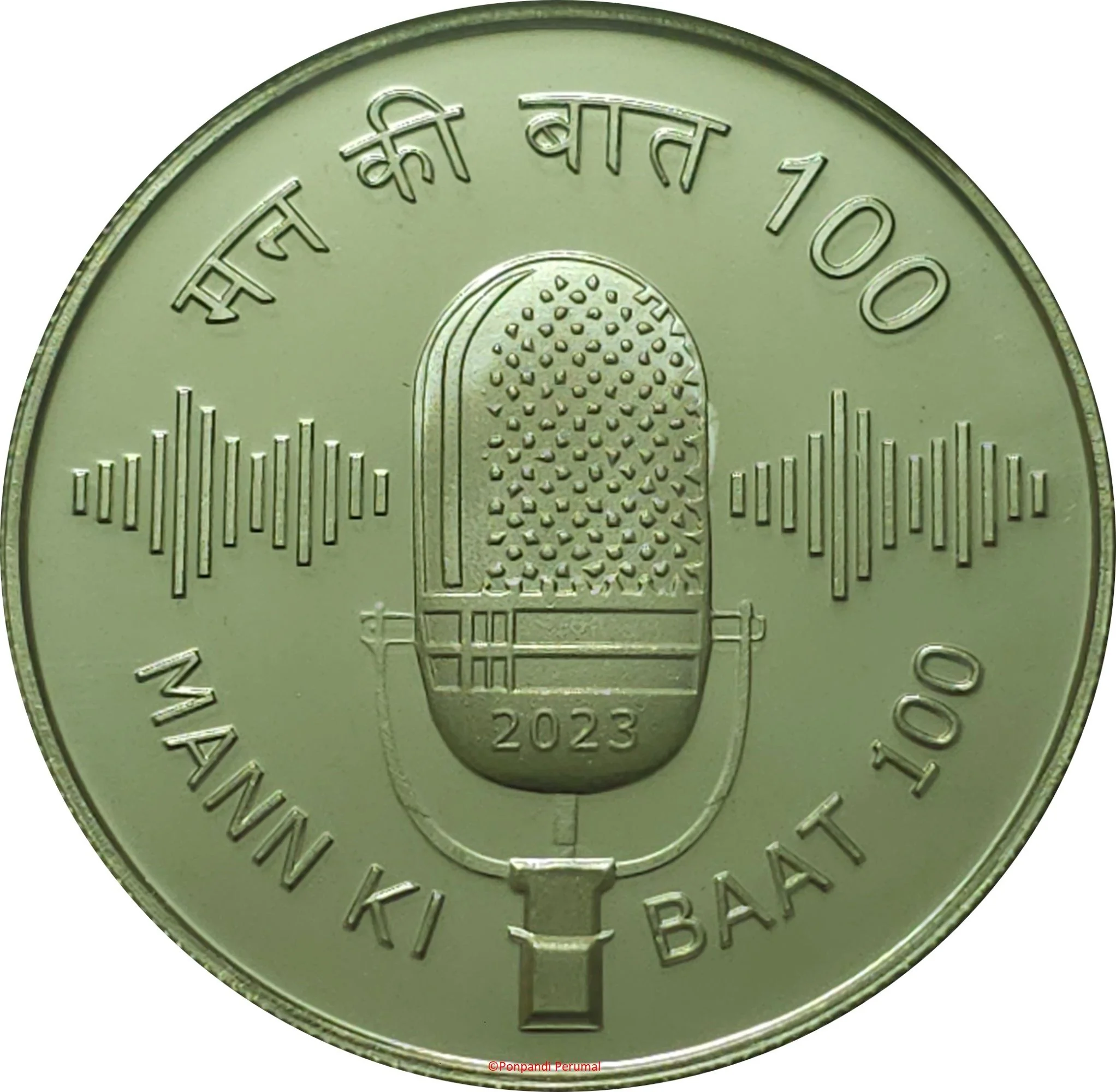 Logo for the 100th episode of Mann Ki Baat, featuring a microphone with sound waves and the year 2023.