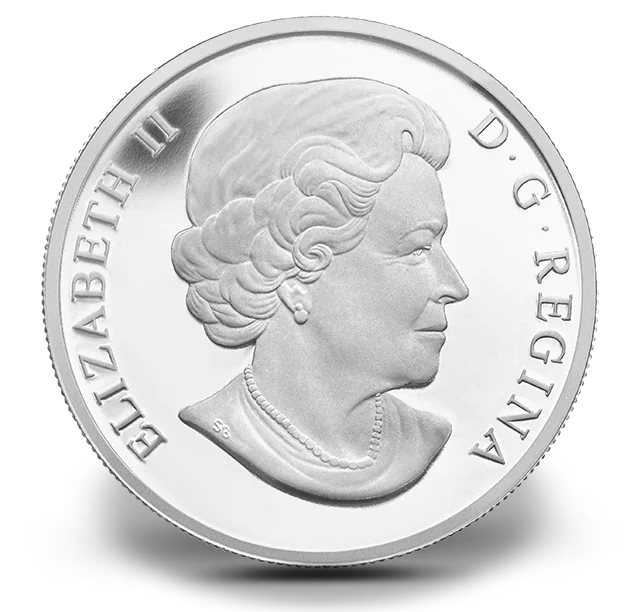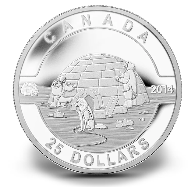 Designed by Canadian artist Yves Bérubé, this coin depicts an Inuit family finishing their igloo. A man cuts a window for an ice block, while a woman with a baby in her amaut smooths the walls. A harnessed husky waits by the entry tunnel.